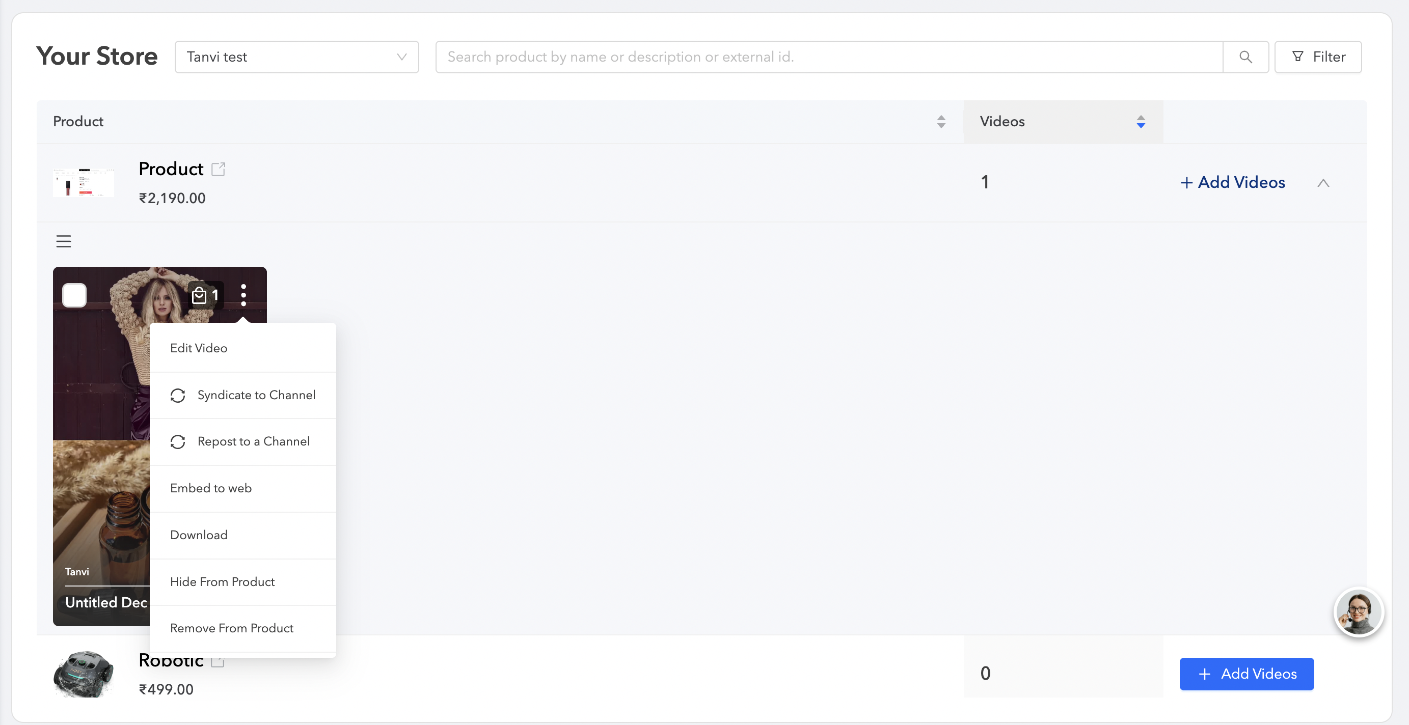 - To add videos to your products, click the "+Add Videos" button, select your desired videos and click "Add" to link the videos to the products.