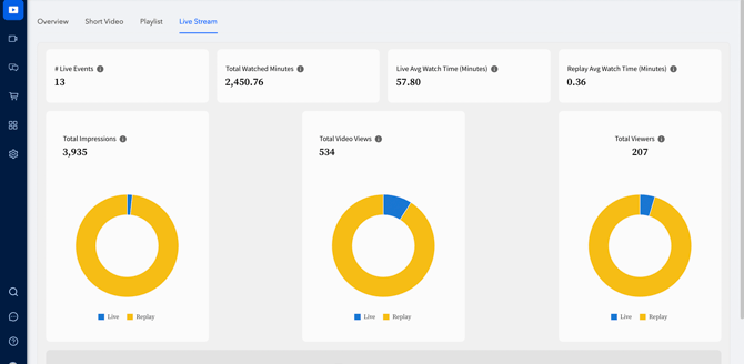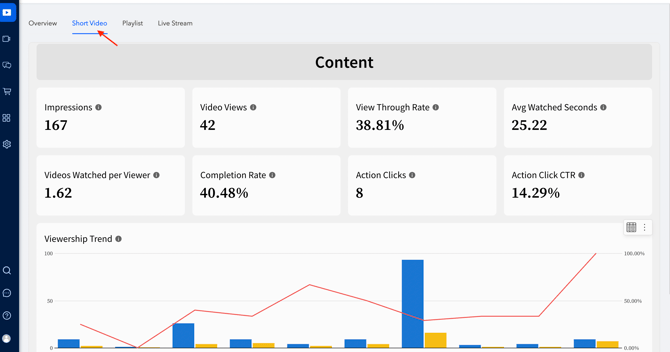 The Short Video tab showcases the performances of short videos and also offers the ability to click on each for detailed performance insights.