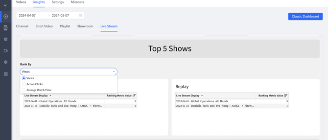 The Live Stream tab will display all of your live streams and their performances. For the Top 5 shows you can select the drop-down menu to Rank by Views, Action clicks, Avg watch time for both Live and Replay.