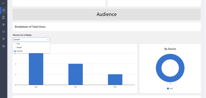 You can explore the audience breakdown of total views by selecting Live, Replay, or Overall data in the Audience section.