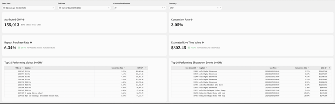 The Overview tab provides valuable insights into the total Attributed GMV generated through video commerce and digital showroom events. It highlights key performance metrics such as Repeat Purchase Rate, Conversion Rate, and Estimated Lifetime Value, showcasing their impact on overall sales. Additionally, it identifies top-performing videos and showroom events, helping businesses refine their content strategies and maximize revenue.