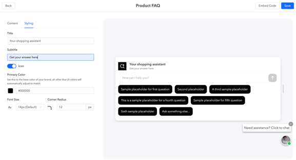 - Fully tailor the FAQ presentation—edit the title, subtitle, enable the icon, choose your primary brand color and adjust the font size and corner radius for visual consistency.
