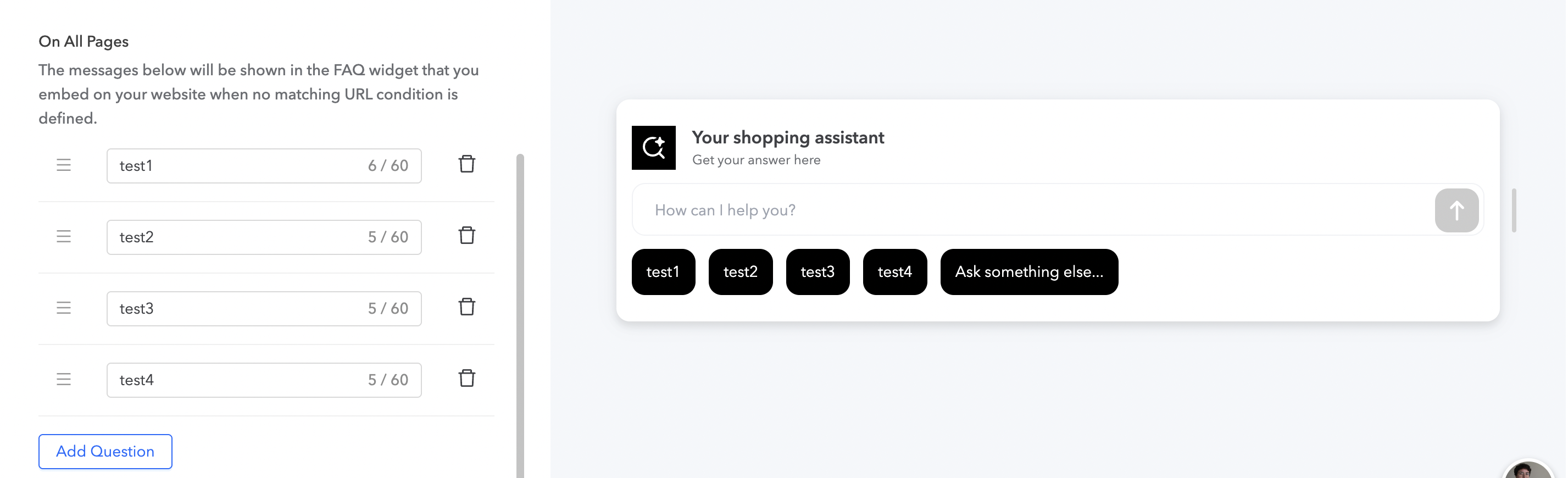 - Add up to six FAQ questions (each up to 60 characters) to provide quick answers and navigation support in the embedded widget.