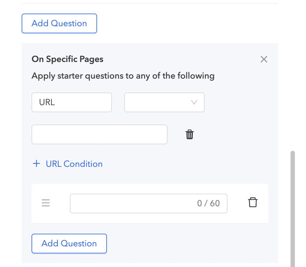 - Additional Question Set - You can establish URL conditions to apply starter questions to specific URLs. To do this, create a new Question Set with designated URL conditions that dictate where these questions will be displayed on various webpages. Simply click on the +Question Set button to add more.