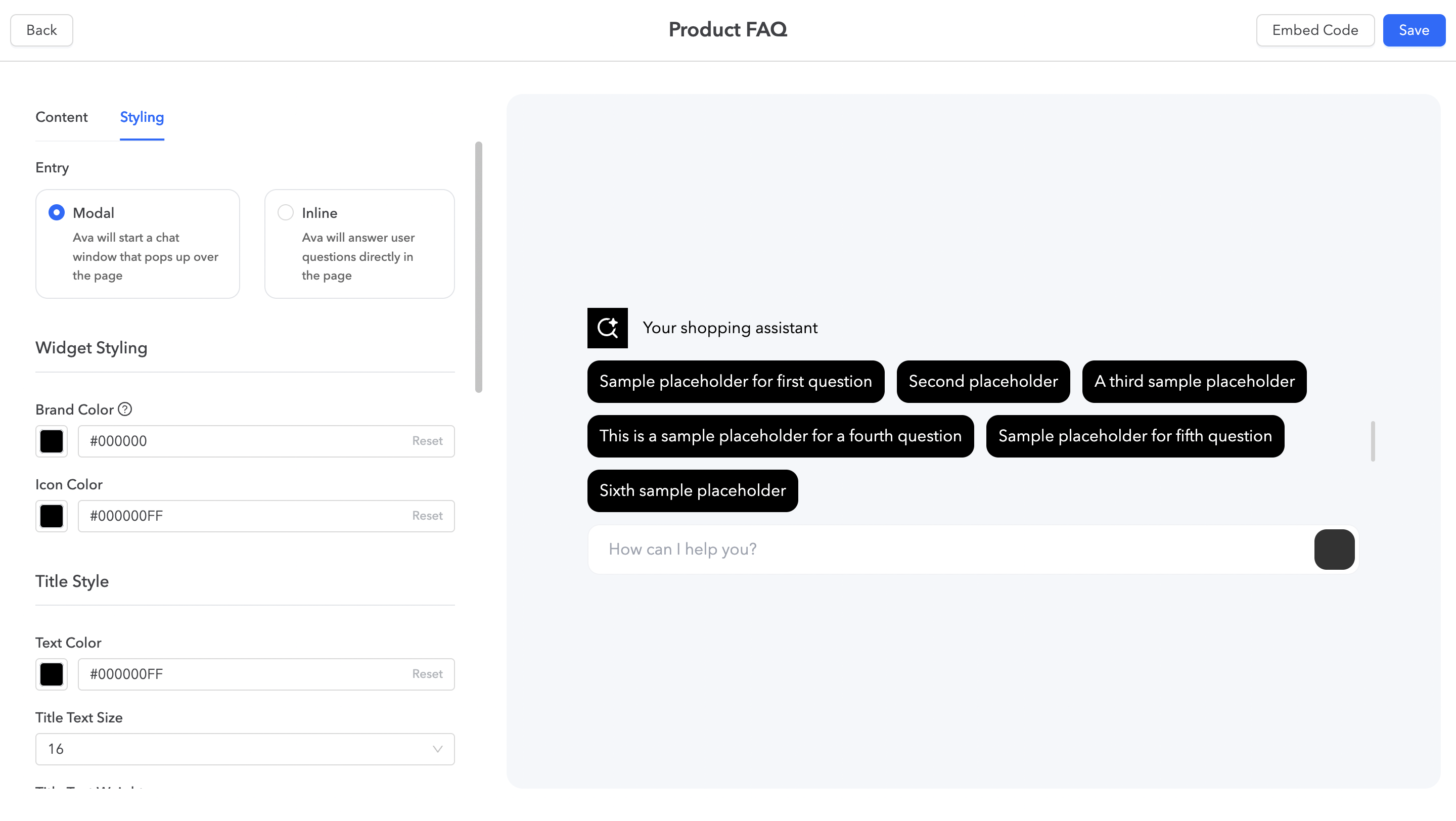 - Add up to six FAQ questions (each up to 60 characters) to provide quick answers and navigation support in the embedded widget.