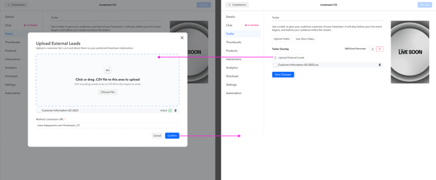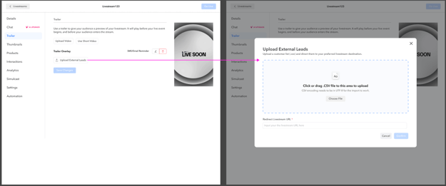 Users can now upload a CSV file containing emails and phone numbers to enroll viewers into Remind Me notifications for a specific livestream.