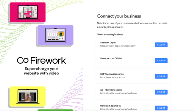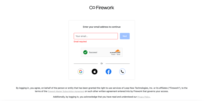 - Fireworkへのサインインページにリダイレクトされます。Fireworkアカウントをお持ちでない場合は、ShopifyでFireworkを無料インストールするか、こちらのリンクからデモをリクエストしてください。