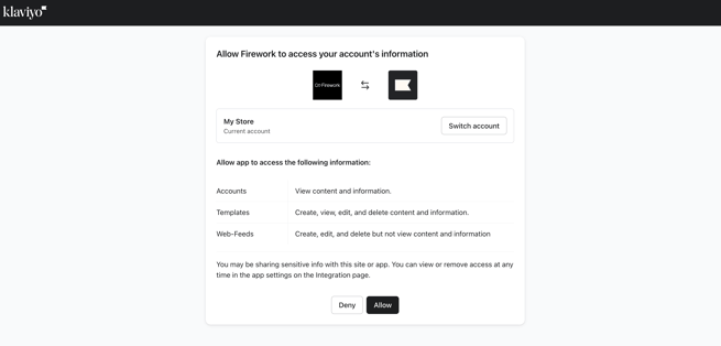 - 続ける(Continue)をクリックした後、FireworkがアカウントにアクセスできるようにするためKlaviyoの許可(Allow)をクリックします。
