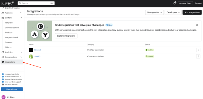- Klaviyoアカウントの左サイドバーにある連携(Integrations)をクリックして、連携のステータスが有効になっているか確認します。