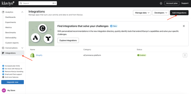 Klaviyoダッシュボードで連携(Integrations)ページへ移動します。右上の連携を追加(Add integrations)をクリックします。