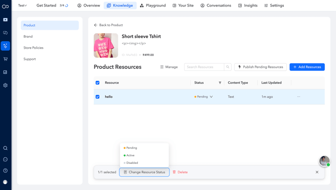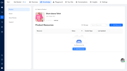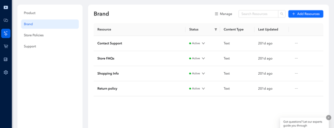 - To include all brand-related information such as contact support, store FAQs, shipping info, or return policy, click on the brand on the left side. This section contains resources not linked to any specific product.