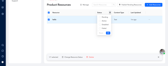 - Click Manage to delete or change the status of any resources. Click Add Resources to add more resources to the product.