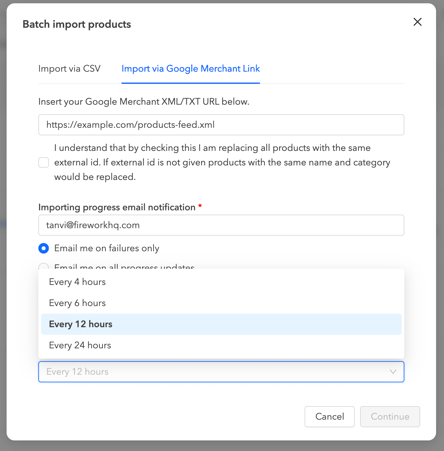 Once enabled, the Auto-Sync configuration options will appear in the “Import via Google XML” modal.